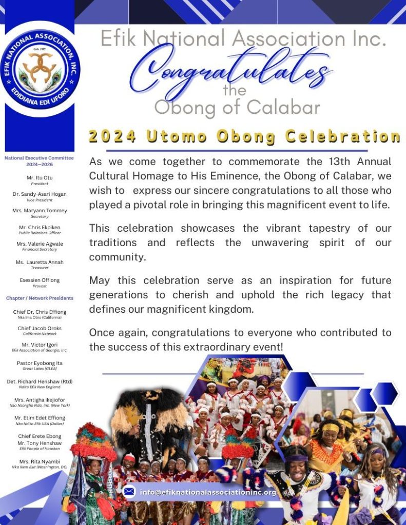 As we come together to commemorate the 13th Annual Cultural Homage to His Eminence, the Obong of Calabar, we wish to express our sincere congratulations to all those who played a pivotal role in bringing this magnificent event to life.