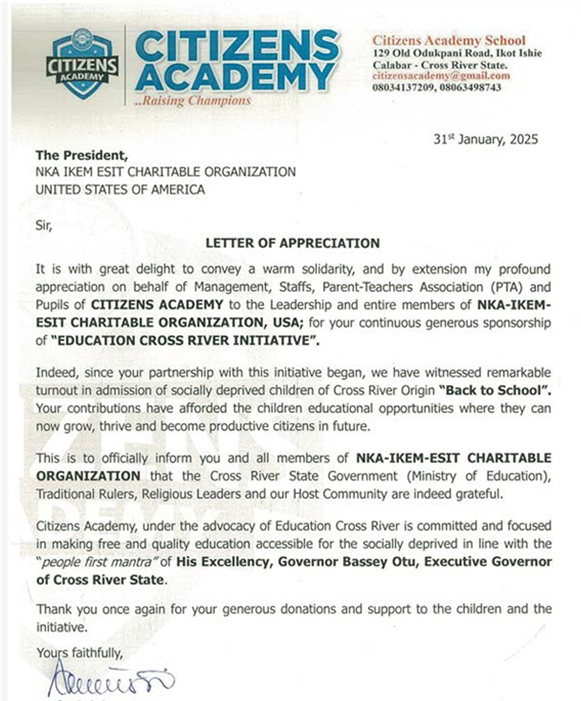 The students are now in a new facility in Parliamentary Village. In December 2023 in the midst of the Christmas Holiday in Calabar, Cross River State Nigeria Above items funded by Nka were presented in a Ribbon Cutting ceremony attended by Chief (Dr.) Chris Effiong (Nka Founder) and Dr. Felicia Bassey-Akamune (Nka Past President) among others. We are so appreciative of your representation. Kudos to NKA Executives and Nka’s project manager for this initiative and all the members of NKA IKEM ESIT Charitable Organization for making this a reality for the Students of Citizens Academy.